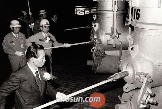 1976년 5월 31일 포항제철소 제2 용광로 화입식에서 직접 불을 댕기는 박정희 대통령(맨 아래)과 뒤쪽의 박태준. 자본도 기술도 없이 출발한 포항제철은 현재 연간 철강생산량 3700만)에 이르는 글로벌 기업으로 성장했다.