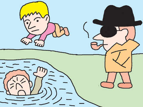 물속에서 허우적거리는(flounder in the water) 히틀러를 본 한 소년이 뛰어들었다(dive into the water). 히틀러가 사는 집 주인의 아들 요한 쿠에베르거였다. 어린 히틀러에겐 천만다행으로(luckily for young Hitler) 제때에 끌어내 목숨을 구했다(pull him out in time and save his life).